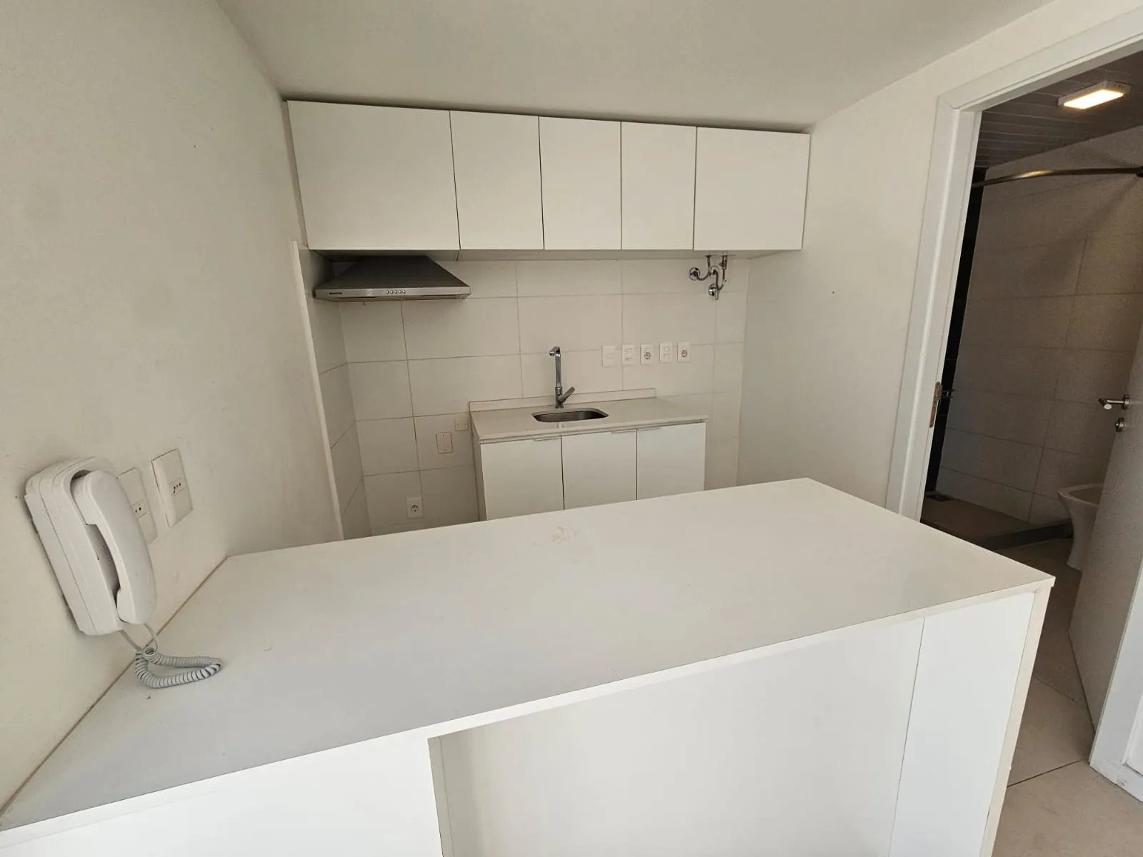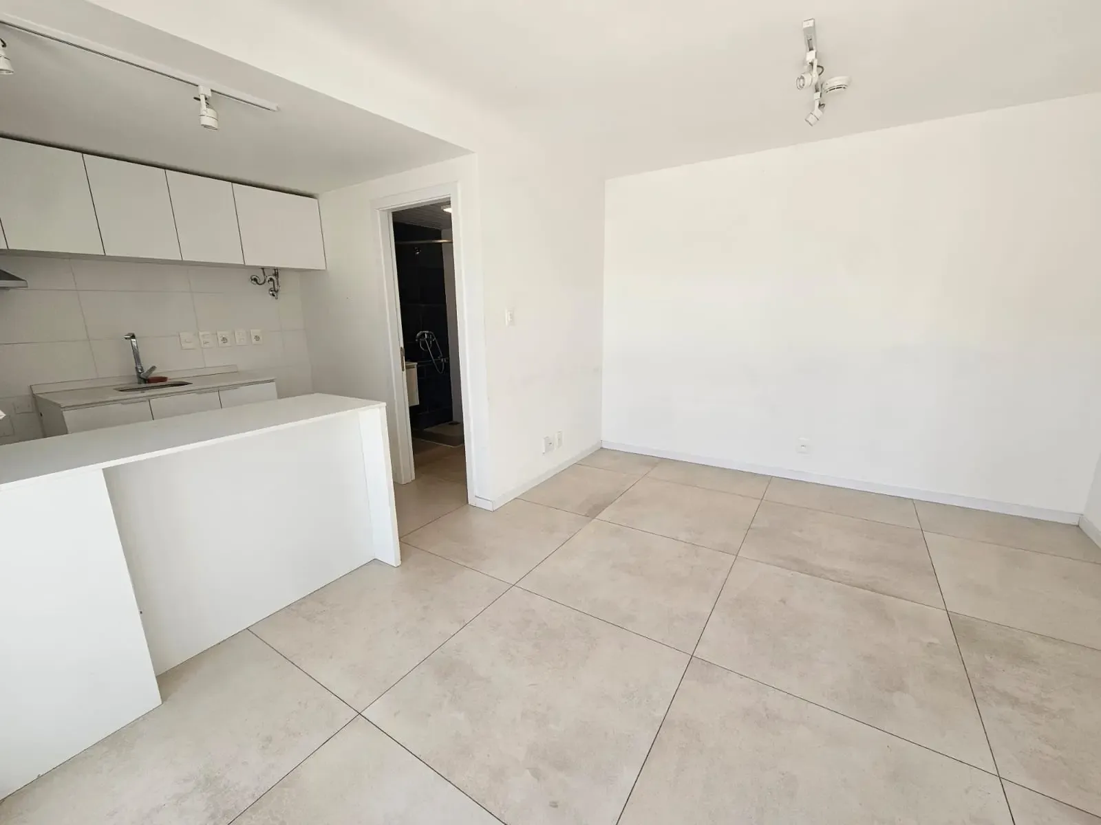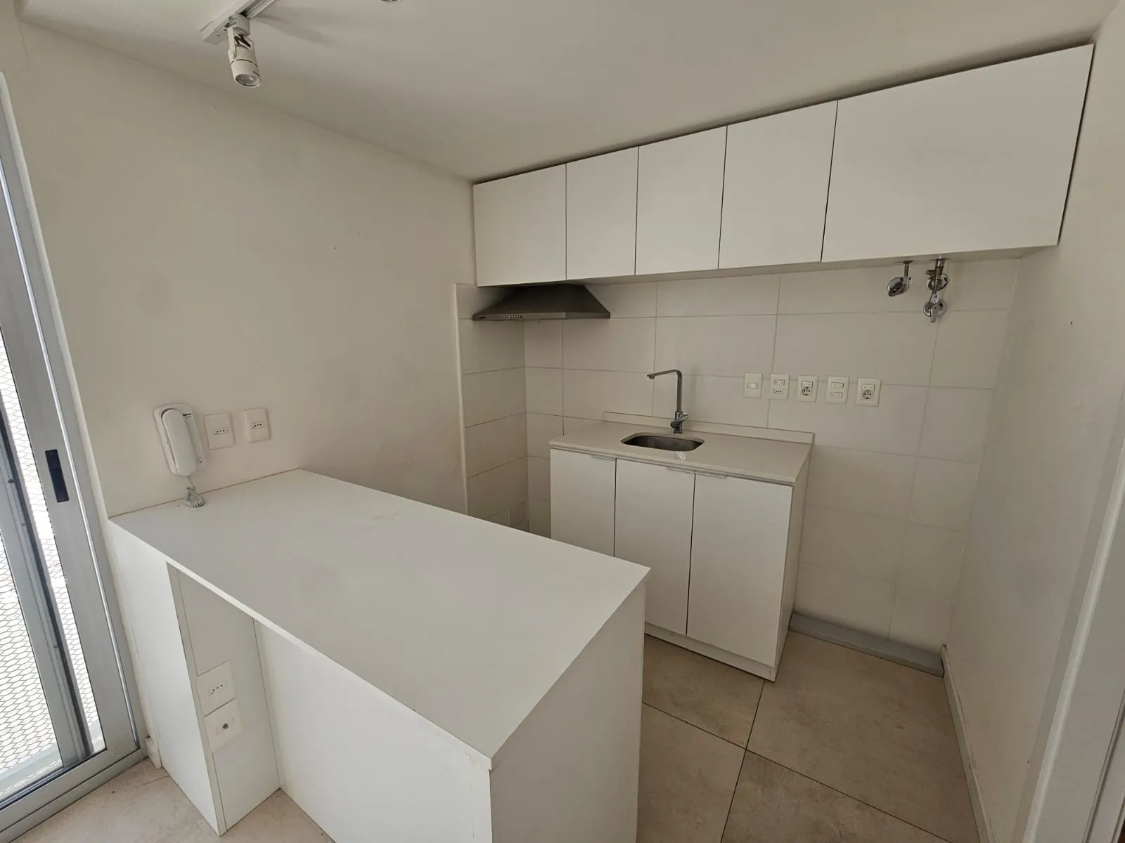 La cocina está equipada con muebles aéreos y bajo mesada, además de una barra desayunador, presentando terminaciones modernas en tonos claros. El baño dispone de ducha, bidet y mueble bajo lavatorio, con revestimientos cerámicos de calidad.