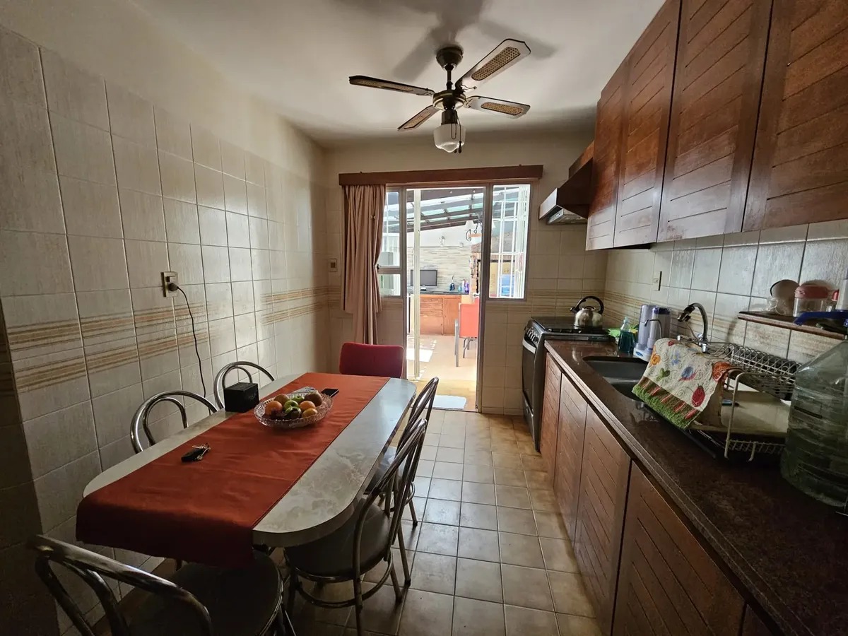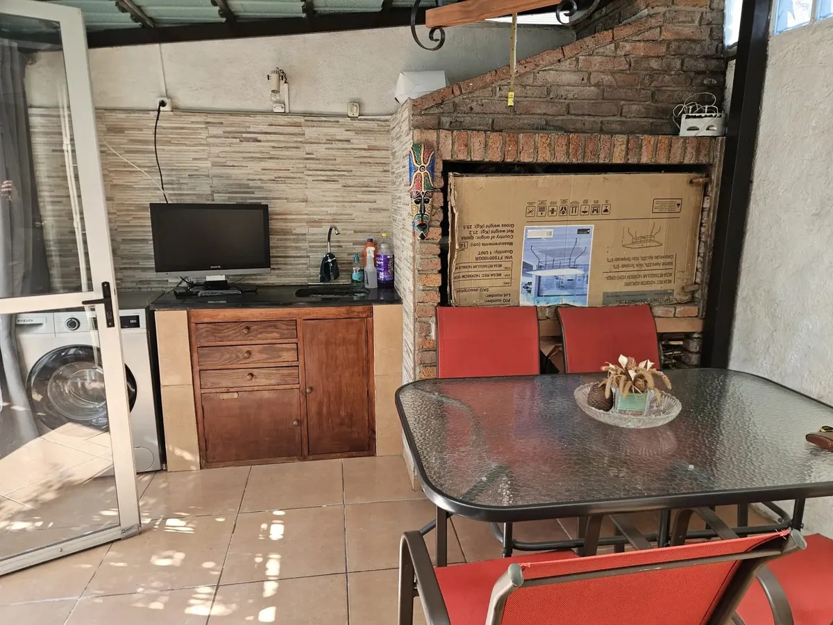 La cocina comedor está equipada con muebles bajo y sobre mesada, doble pileta y salida directa a una barbacoa cerrada, que conecta con una habitación de servicio y baño adicional.